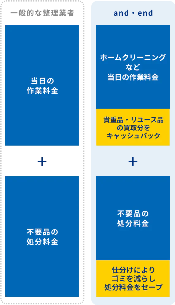 主な料金は「仕分け・回収・ホームクリーニング作業」と「不要品の処分」。そこから、丁寧に査定した「貴重品・リユース品」の買取分を、キャッシュバック。できるだけお客様の負担を減らし、モノと思い出を大切にするand・endの料金システムです。