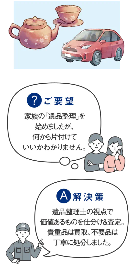 遺品整理に伴う貴重品・リユース品の買取や、不要品の回収などを含むホームクリーニングを承っています。